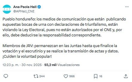 Desde su cuenta oficial en la red social X (antes Twitter), Hall señaló: “Pueblo hondureño: los medios de comunicación que están publicando supuestas bocas de urna con declaraciones de triunfalismo, están violando la Ley Electoral, pues no están autorizados por el CNE y, por ello, debe deducirse la responsabilidad correspondiente”.
