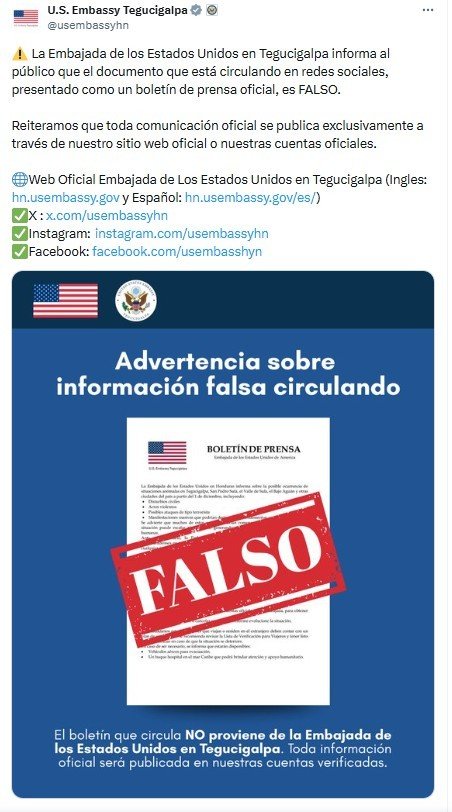 La propia Embajada de los Estados Unidos desmintió públicamente dicha información, aclarando que no había emitido ningún comunicado relacionado con alertas de violencia durante el proceso electoral, confirmando que se trataba de contenido falso elaborado y difundido con fines de manipulación política y social.