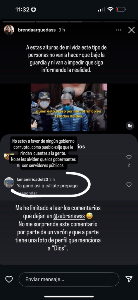 Asimismo, Arguedas lamentó que este tipo de ataques reflejen una cultura en la que “como mujer no podemos ya ni expresarnos, ni decir nada, ni hacer nada, porque somos un objeto visual de complacencia para los hombres”, evidenciando el impacto diferenciado que la violencia digital tiene sobre las mujeres periodistas y comunicadoras.