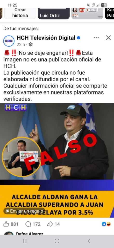 Tegucigalpa, Francisco Morazán (C-Libre).- En la publicación apócrifa se aseguraba que, supuestamente, HCH informaba que “el señor Aldana ganó la alcaldía de Tegucigalpa superando a Diego Zelaya por un 3.5%”, dato que no había sido confirmado por ninguna autoridad electoral competente ni correspondía a los contenidos oficiales del medio.