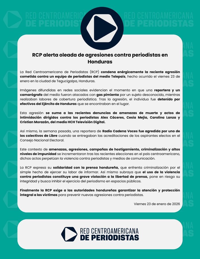 Por su parte, la Red Centroamericana de Periodistas (RCP) emitió una fuerte condena al ataque sufrido por el equipo de Telepaís y señaló que este episodio se suma a otras expresiones de violencia, amenazas e intimidaciones dirigidas a comunicadores en el país.