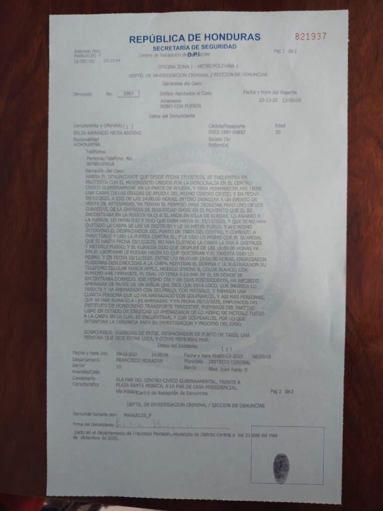 C-Libre documenta esta situación en el marco de su monitoreo permanente sobre libertad de expresión y protesta social en Honduras. La persistencia de actos de intimidación o perfilamiento contra personas que ejercen una manifestación pacífica podría constituir una forma de restricción indirecta al derecho a expresarse y participar en los asuntos públicos.