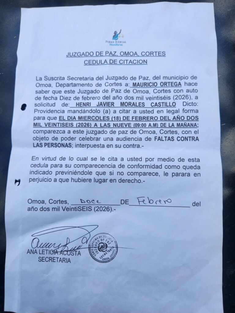 Omoa, Cortés (C-Libre).- El comunicador social Mauricio Ortega enfrenta lo que considera un proceso de criminalización derivado de su labor informativa puesto que recibió una llamada de la Secretaría Municipal del Juzgado de Paz de Omoa, citándolo a comparecer a una audiencia de FALTAS CONTRA LAS PERSONAS; interpuesta en su contra.