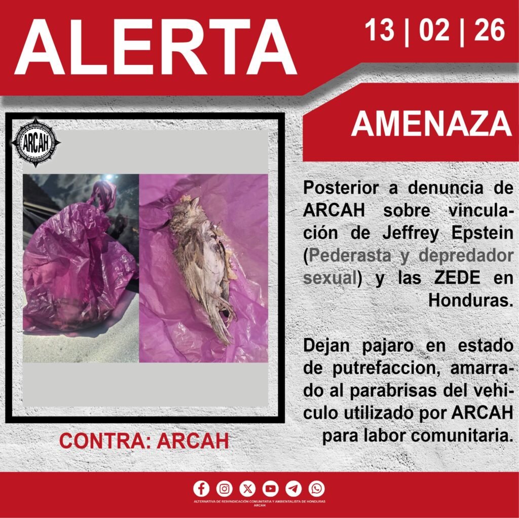 Tegucigalpa, Francisco Morazán (C-Libre) De acuerdo con la información que trascendió en las redes sociales, tres días después que la organización Alternativa de Reivindicación Comunitaria y Ambientalista de Honduras (ARCAH) denunciara públicamente la presunta vinculación del financiero estadounidense Jeffrey Epstein con el proyecto de las Zonas de Empleo y Desarrollo Económico (ZEDE) en Honduras, fue colocado un objeto intimidatorio en el vehículo de uno de sus integrantes.