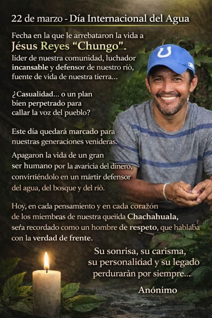 Medios locales reportan que Jesús Reyes, era conocido como “Chunga” y se destacaba como miembro del patronato de la comunidad y su compromiso con la protección del río Chachaguala, en el departamento de Cortés. Considerando que fue asesinado en el marco celebrativo del Dia Internacional del Agua, mensajes anónimos sostienen que “apagaron la vida de un gran ser humano por la avaricia del dinero, convirtiéndolo en un mártir defensor del agua, del bosque y del río”.