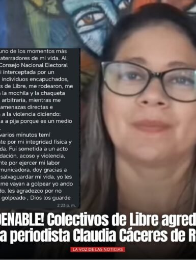 ALERTA 03-2026 Tegucigalpa, Francisco Morazán (C-Libre).- La periodista Claudia Cáceres, reportera de Radio Cadenas Voces (RCV) relató en sus redes sociales que, al salir de las instalaciones del Consejo Nacional Electoral (CNE), fue interceptada por un grupo de individuos encapuchados, identificados como colectivos del partido Libertad y Refundación (Libre), los […]